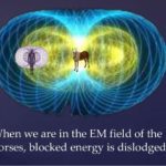Horses are said to have an energy field that extends far beyond their physical body. Research has indicated that the human heart rate will slow down when within the energy field of a horse. While the human energy fields appears to move upward and around the body, the horse’s field runs deep into the earth. It is theorized that herd animals can communicate through this energy field to one another because of this extension down into the ground.