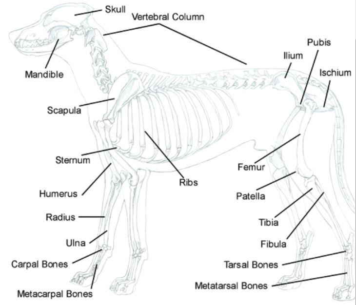 The dog is a quadruped, walks on 4 legs, so the skeleton differs considerably from the human bipedal skeleton. Notably, the pelvis is shaped less like a bowl and more like a table; and the shoulder and hip are more stable and less mobile than in the human form. It is critical to know the names and locations of the bones before learning the musculature of the dog, because it is the bones where the muscles attach and upon which they exert their influence. It is not necessary to memorize the information presented here in preparation for the practicum. Use this material as a reference as you continue to deepen your knowledge in this area. The more you review and use this new language, the sooner it will become second nature to you.